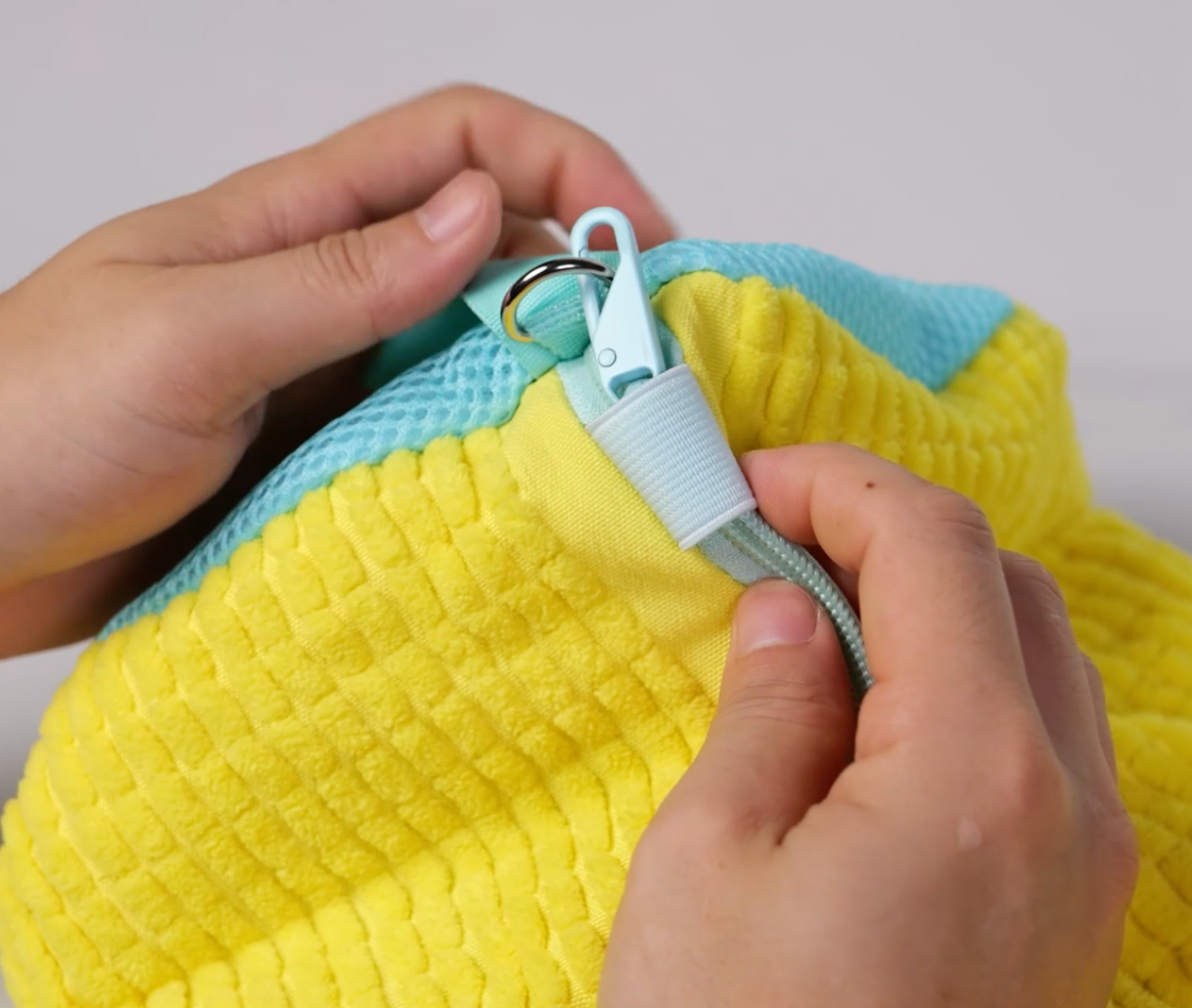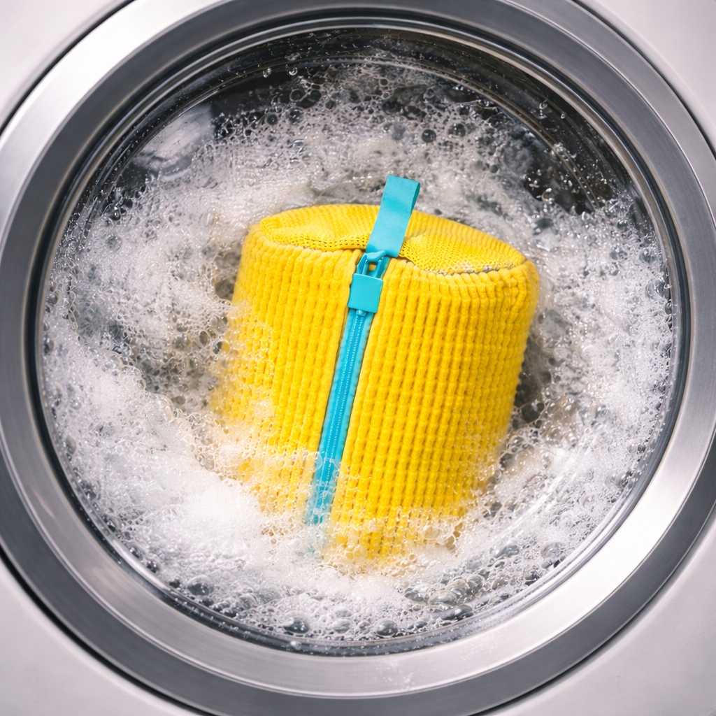 Add detergent inside and outside the bag, zip it, and put it in the washing machine.