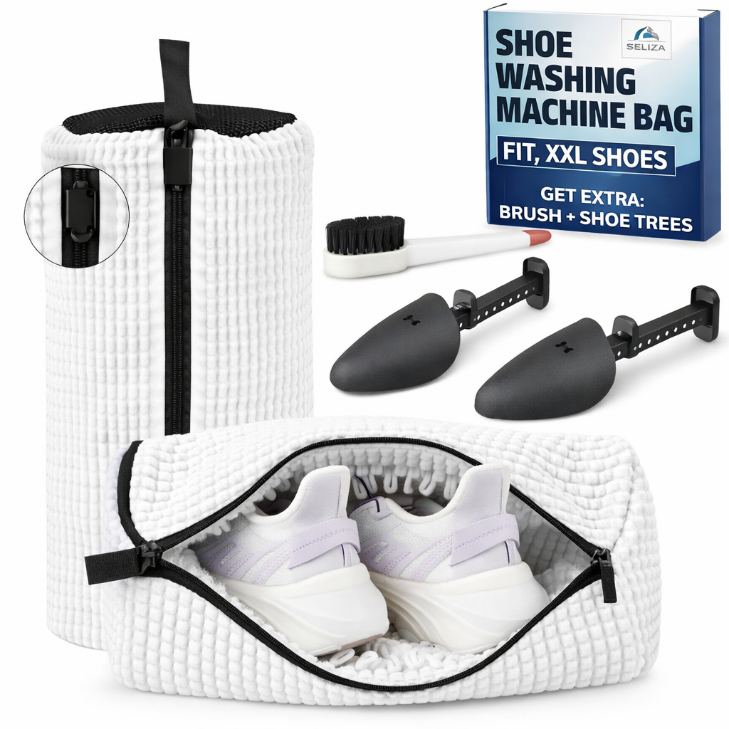 The package includes shoe supports to prevent your shoes from curling or creasing, and one cleaning brush. A washing bag is also included. We recommend using at least two for optimal results.